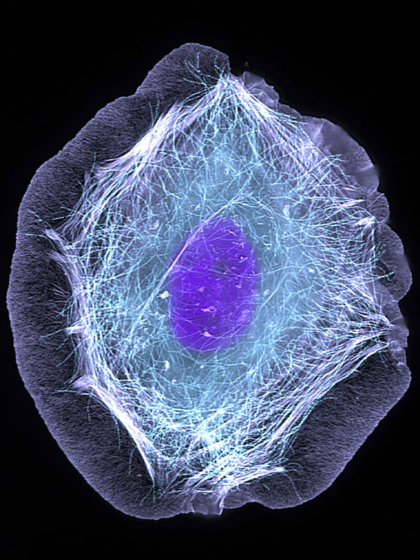 Per una singola proteina, lo spazio della cellula equivale ad una multinazionale enorme, con scopi e movimenti che non può comprendere, di cui prende solo una piccolissima parte. Guardate l’immagine qui sopra (è un’immagine vera fatta al microscopio!): se viaggiassimo nel citoplasma, il liquido dentro la cellula, sembrerebbe di viaggiare nello spazio popolato da autostrade superaffollate di una metropoli, dove regna il caos, ma dove ogni singola persona sa dove deve andare e dove sta andando. E nell’immagine si vedono solo i filamenti responsabili di mantenere la struttura della cellula! Immaginate come e dove stanno tutti gli altri dipartimenti e uffici!